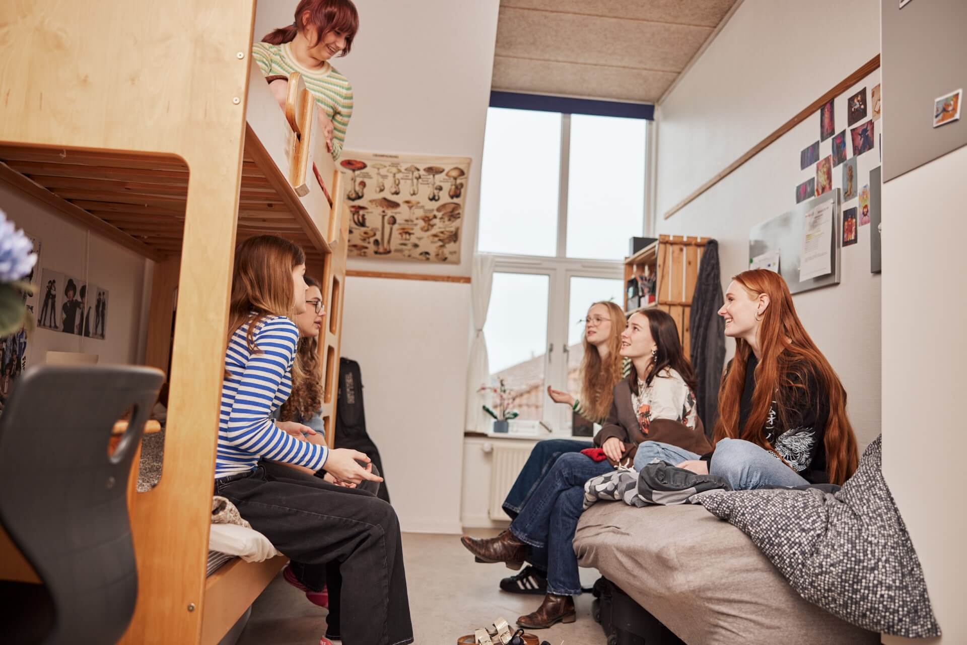 En af de spændende udfordringer, man har som efterskoleelev, er at bo sammen med andre mennesker i så lang tid. Alle elever bor på to- eller tremands værelser. Man kan få utrolig megen glæde og gavn af hinanden på værelserne både socialt og fagligt. Derfor er det også en del af den daglige rutine, at man er på egne gange kl. 21.30 og på egne værelser kl. 22.00.